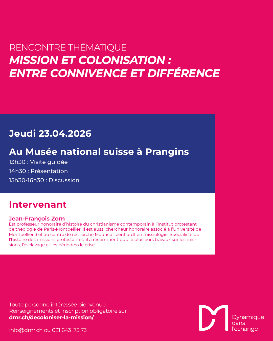 En 2026, DM organise une série d’événements consacrés à la justice. Inspiré par la citation biblique « Heureux celles et ceux qui ont faim et soif de justice » (Mt 5,6), ce programme invite à repenser la mission protestante face aux héritages coloniaux et aux enjeux contemporains. Conférences et rencontres jalonneront l’année pour ouvrir le dialogue et imaginer des relations plus justes.